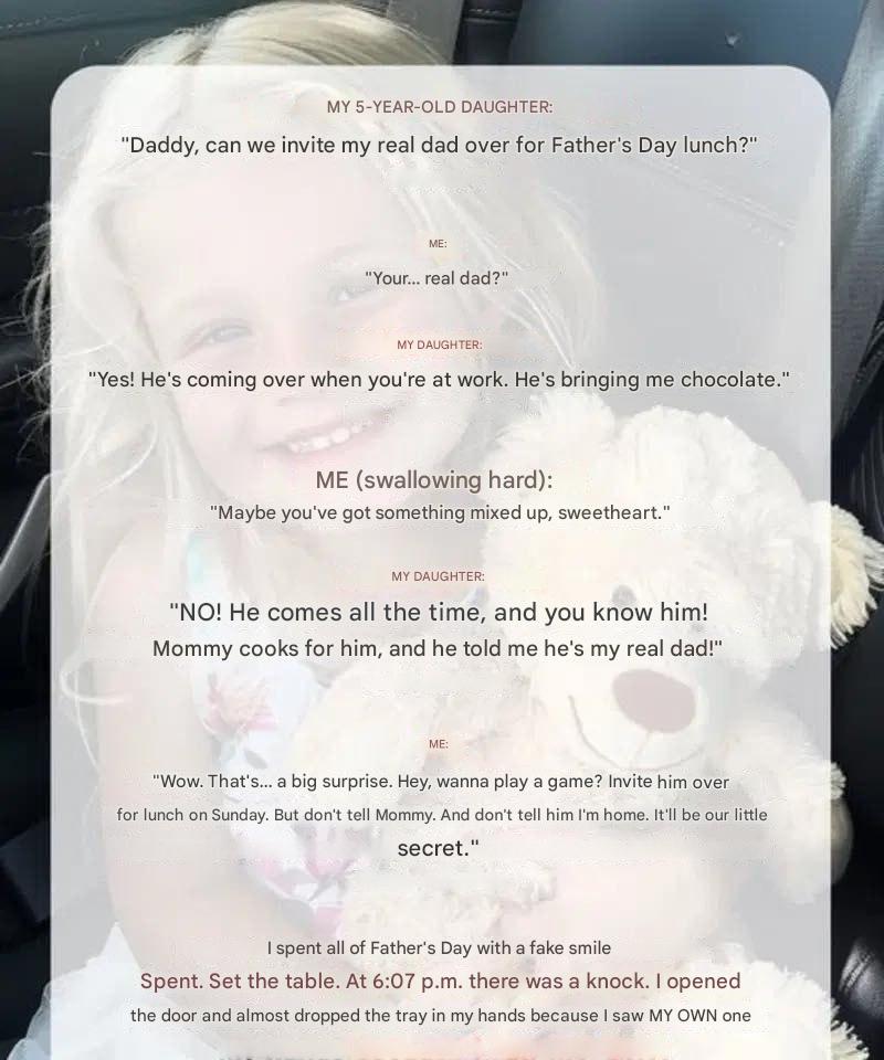 “He comes all the time and brings me nice things like chocolate, and we have tea parties. Mom sometimes cooks for him, and you know him. He told me he’s my real dad.”